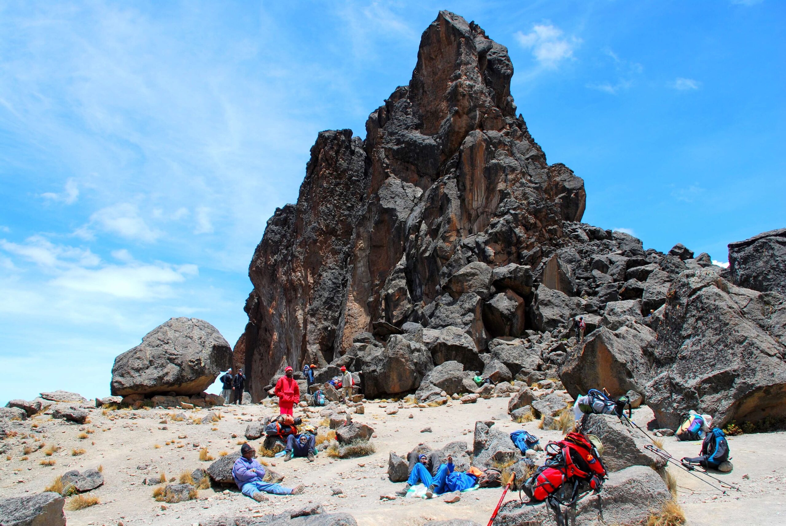 Nadszedł nasz dzień prawdy, w którym pokora „musiała” pokonać harce. Wyszliśmy ponad 4600 m n.p.m., pod Lava Tower. Na tej wysokości krok stał się wolniejszy, a wysiłek energetyczny większy. Organizm walczył, nie poddawaliśmy się, choć pobyt na tej wysokości dla kilku z nas był nowym doświadczeniem. Zeszliśmy do Barranco Camp otoczonego skałami i gigantycznymi roślinami. Spaliśmy snem sprawiedliwych. Kolejnego dnia, przed nami pojawiła się ściana Barranco Wall – ściana, która wygląda jak granica między możliwym a niemożliwym. Podejście nie wymagało wspinaczki, raczej pokory i skupienia. Na szczycie tego wzniesienia znaleźliśmy się powyżej chmur, obserwując coraz bardziej zbliżające się Kilimandżaro. Szlak na BarafuCamp prowadził przez jałową pustynię z lawowych okruchów. Znaleźliśmy się w otoczeniu księżycowego krajobrazu, bez roślin i dźwięków. Barafu było miejscem jednodniowego odpoczynku. Naszym celem było wejście całej 6 osobowej grupy, stąd dodatkowy dzień aklimatyzacji i noc powyżej 4500 m npm okazały się właściwym wyborem.