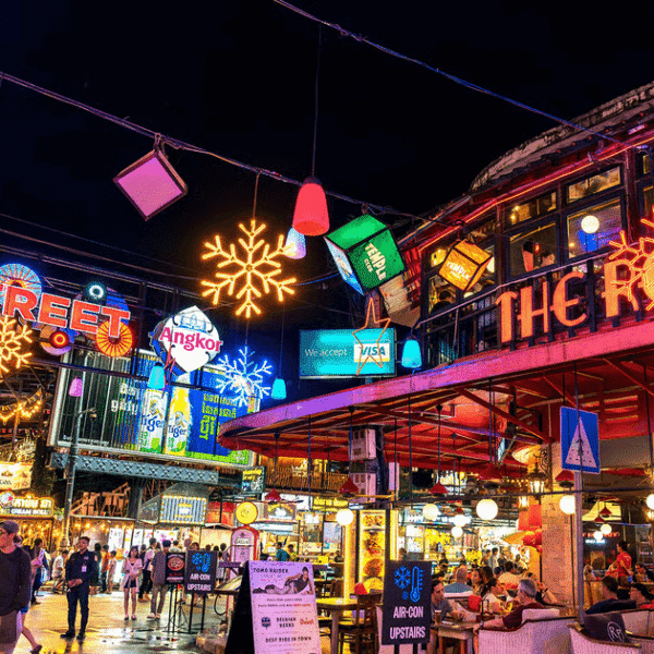 Siem Reap łączy tętniące życiem centrum z kolonialną architekturą. To także centrum kultury Khmerów – tu można zobaczyć pokazy tradycyjnego tańca Apsara. Wieczorem warto odwiedzić nocny targ – rękodzieło, pamiątki, jedzenie uliczne. Pub Street to serce rozrywki – restauracje, bary i atmosfera idealna na relaks po całym dniu zwiedzania.